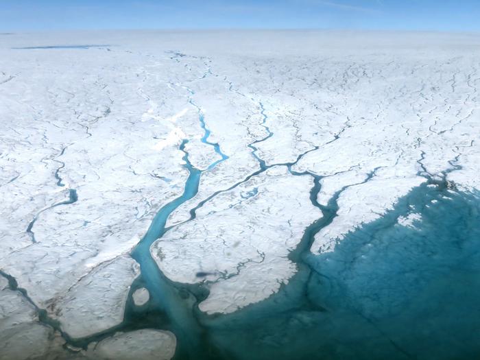 Meltwater streaming across the top of the Greenland ice sheet. A study led by researchers at The University of Texas at Austin examines the flow and freezing of meltwater within old snow on the ice sheet, which can help improve estimate of sea level rise.