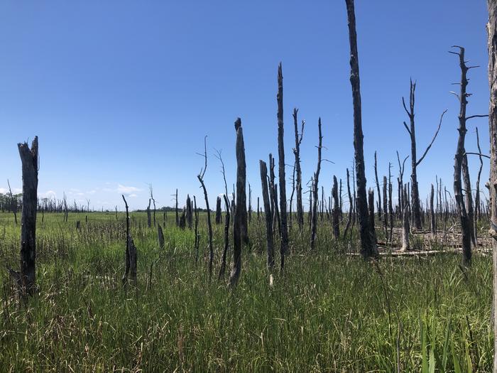 When trees in coastal areas die a graveyard of dead trees—known as a ‘ghost forest’ is left behind. Salt-tolerant marsh plants take root and form a green carpet below the remains of the once-thriving forest. Image: LeeAnn Haaf.