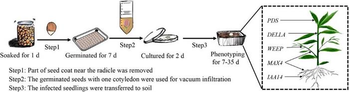 The study’s method begins by removing the seed coat and one cotyledon from germinated seeds, followed by vacuum infiltration with Agrobacterium containing TRV vectors. The seedlings are then grown in soil for phenotyping. This approach achieved gene silencing rates between 48% and 87%, effectively targeting genes like PpMAX4 and PpWEEP. Notably, silencing PpMAX4 increased lateral branching and root mass, while PpWEEP silencing resulted in pendulous growth in dark conditions. The method also succeeded in silencing multiple homologous DELLA genes, addressing functional redundancy and enabling detailed analysis of gene roles in peach growth and development.