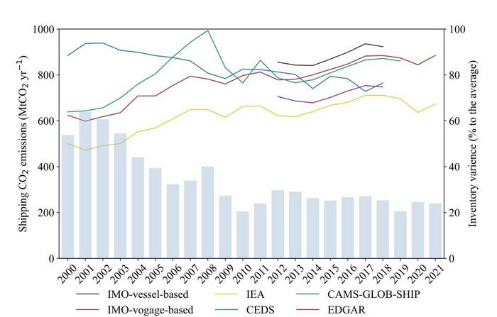 Fig. 1 Global CO2 emissions from shipping 2000–2021. The lines represent historical CO2 emissions (Mt yr−1) from the emission inventories listed in Table 1, and the bars represent the ratios of variances between above emission inventories to their average values