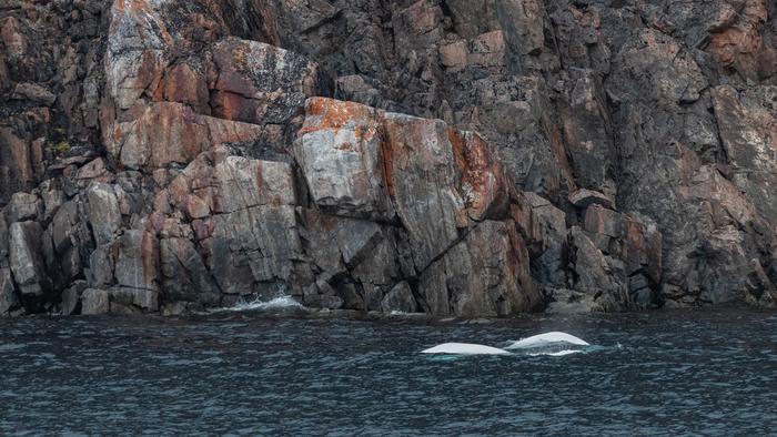 Beluga whales, which are known for their white colour, in the Bellot Strait in Nunavut, Canada