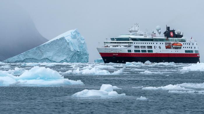 MS Fram (Merchant Ship Fram), an HX passenger ship, at Eqip Sermia, a glacier in Greenland.