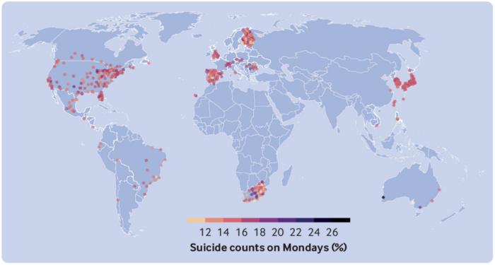 Locations of the 740 sites in 26 countries included in the study and the percentage of suicide counts on Mondays during the study period.