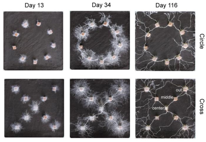 Fungal mycelial networks connecting wood blocks arranged in circle (left) and cross (right) shapes.