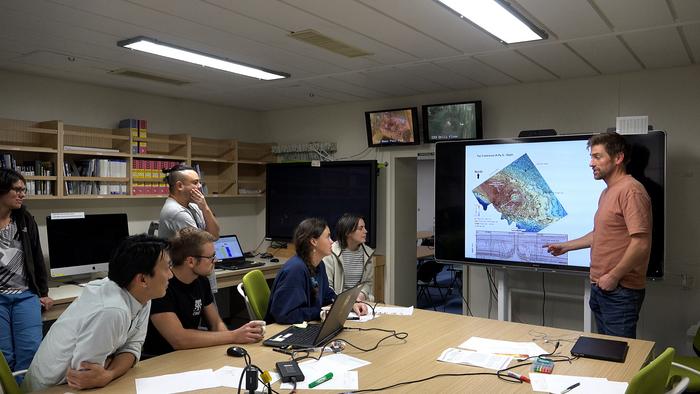 Dr Uisdean Nicholson presenting his findings to scientists on board a drilling ship.