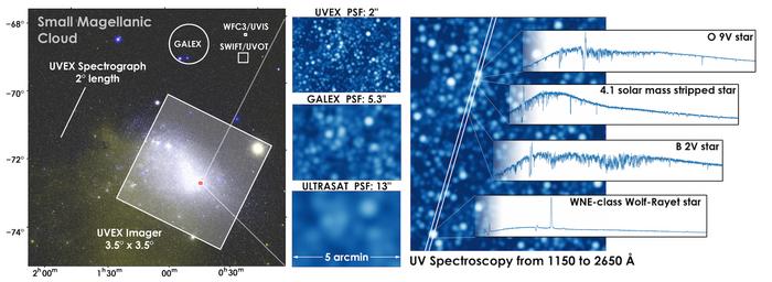 UVEX capabilities compared to select other UV telescopes. Illustration with simulated images demonstrating UVEX’s special resolving power and spectrographs.