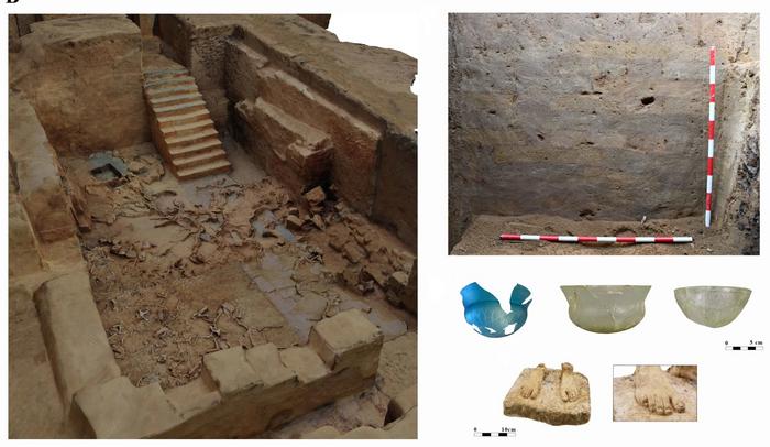 2. Mudbrick wall documented in the south corridor of the structure and a selection of imported materials, including glass bowls from the Eastern Mediterranean and a fragment of Pentelic marble sculpture.