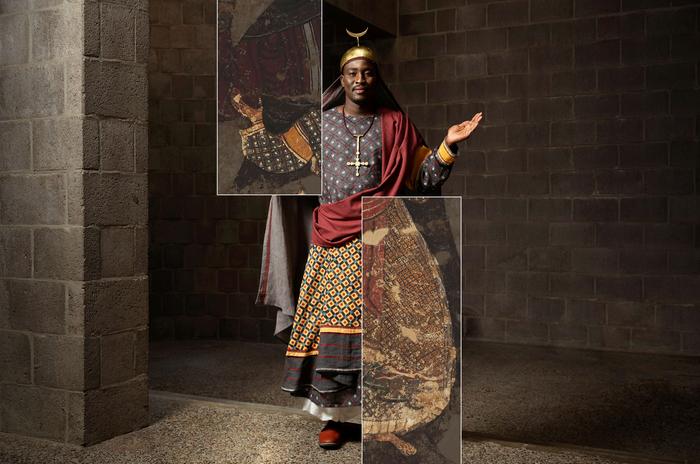 The reconstructed costumes were presented on models to fully showcase their physical form and impact on viewers. Sudanese people, representatives of the communities from the Netherlands and Germany, impersonated Nubian dignitaries and were photographed at Pastoor van Ars Church in The Hague. The artistic concept and styling of the photographs were created by Paulina Matusiak, with the photos taken by Eddy Wenting.