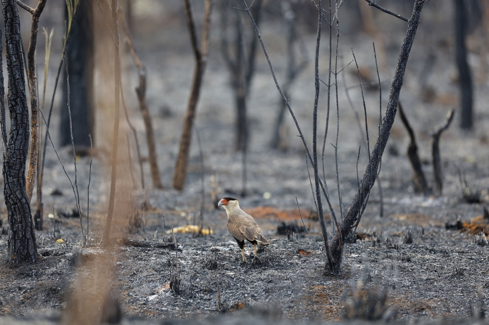 A bird is seen in a burned area of the Embrapa Biological Reserve on the day the Brazilian capital broke the historic drought record set in 1963 by reaching 164 consecutive days without rain, according to the Meteorological Institute, in Brasilia, Brazil October 4, 2024.