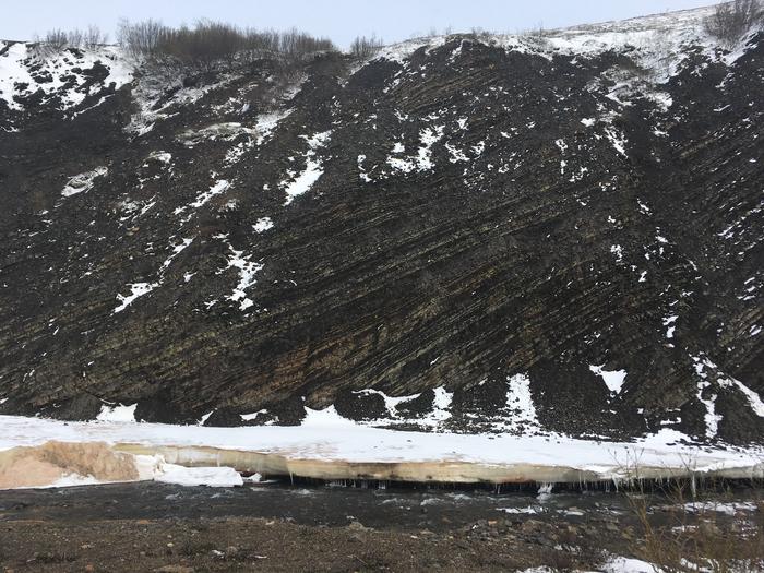 Image 2: Thaw slump on the Peel Plateau, which exposes sulfide and carbonate minerals in glacial sediments to surface weathering reactions in lower slope regions with relict ice (Credit: Suzanne Tank)