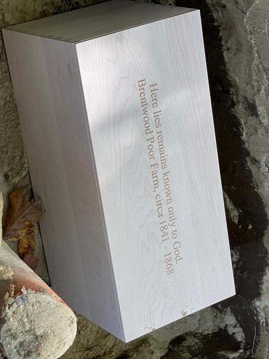 Caption: A local cabinet shop donated their time to craft a simple wooden box for the poor farm remains that was inscribed with “Here lies remains only known to God, Brentwood Poor Farm, circa 1841 – 1968”.