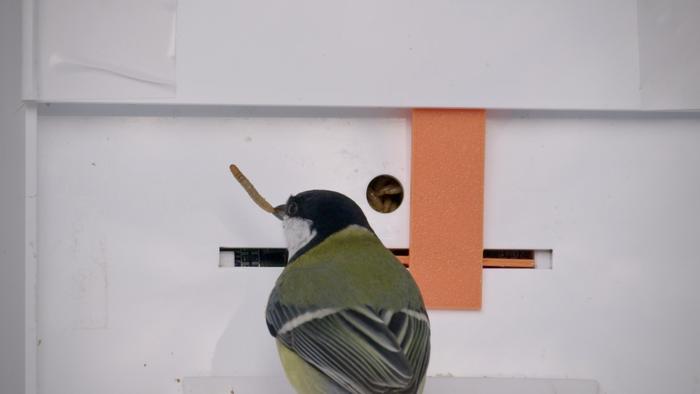 Image of great tit solving puzzle box to gain a food reward.