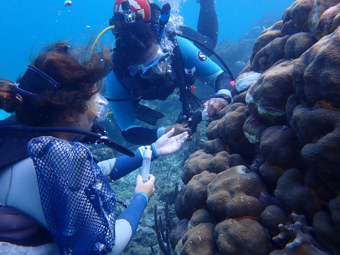 The study’s co-authors Argel Horton and Laura Arton apply the chlorine paste to a large coral (Orbicella annularis). The bright white area is where the treatment has already been applied. Image: Dr Graham Forrester.