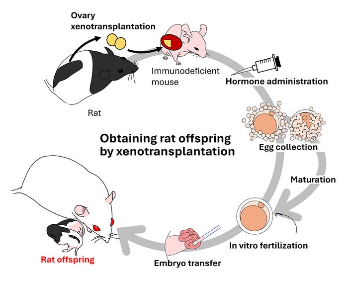 The researchers xenotransplanted rat ovaries into renal capsules of immunodeficient mice. After transplantation, rat oocytes were retrieved from the mice, matured and fertilized in vitro. Finally, the rat embryos were transferred to recipient rats and offspring were obtained.