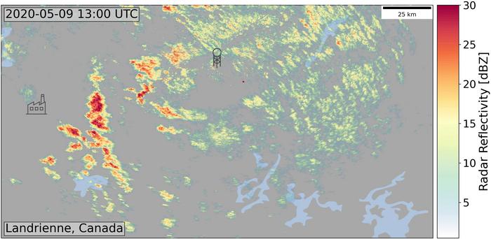 Weather radar images show a plume of snow downwind of the Rouyn-Noranda copper smelter in Canada. The weather radar is located near Landrienne, Canada.
