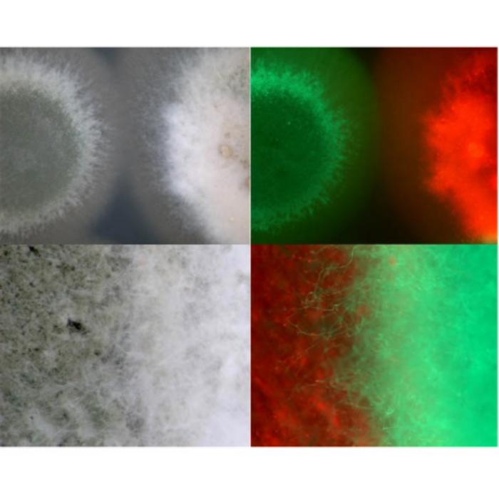 Using advanced imaging techniques with fluorescent proteins that made the fungi glow red or green, the scientists observed how the fungi interacted when colonizing (infecting, spreading inside and eventually killing) insects. Rather than one strain dominating and excluding the other, the team found that the fungi neatly divided their territory amongst themselves—quite literally.