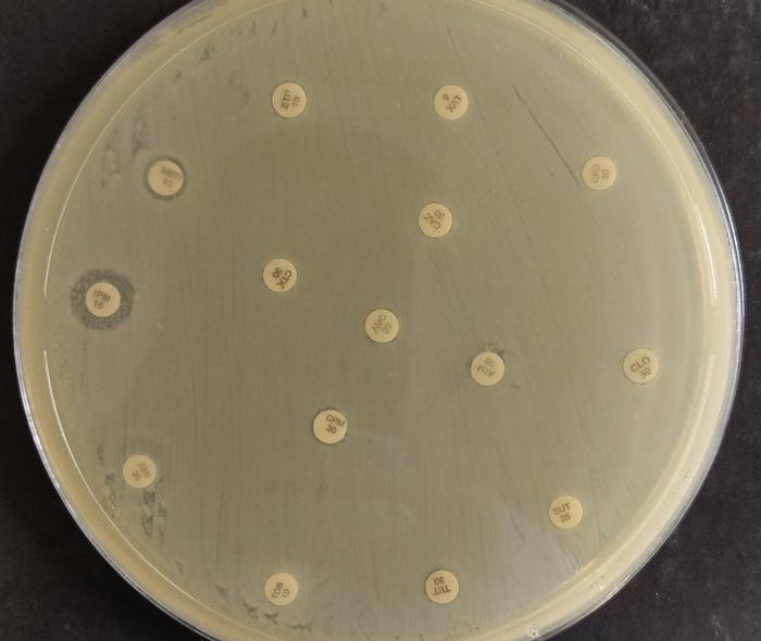 Antibiotic susceptibility test showing Klebsiella pneumoniae to be resistant to all antibiotics. Thin paper discs each containing an antibiotic were placed on an agar plate with the bacterium, which continued to grow in contact with all 15 antibiotics tested