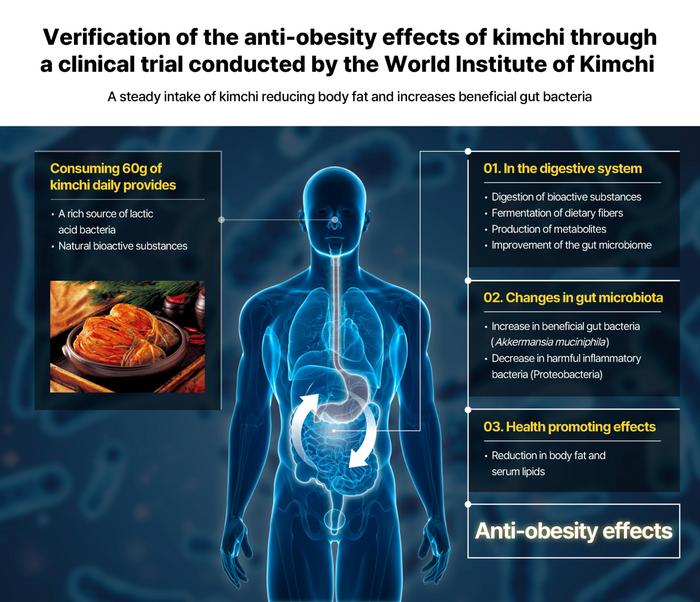 Approximately 16% of the global population, or about 890 million people, suffer from obesity. The World Health Organization (WHO) has recognized obesity as a significant health issue and highlighted its impact on the quality of life and overall health of individuals across the world. In response to this, the World Institute of Kimchi, South Korea, has been publishing a series of articles on the anti-obesity effects of kimchi in international journals. These articles, based on research studies on the subject, indicate that the regular consumption of kimchi, a traditional Korean fermented food, is effective in reducing body fat and may serve as a promising dietary strategy to combat obesity.