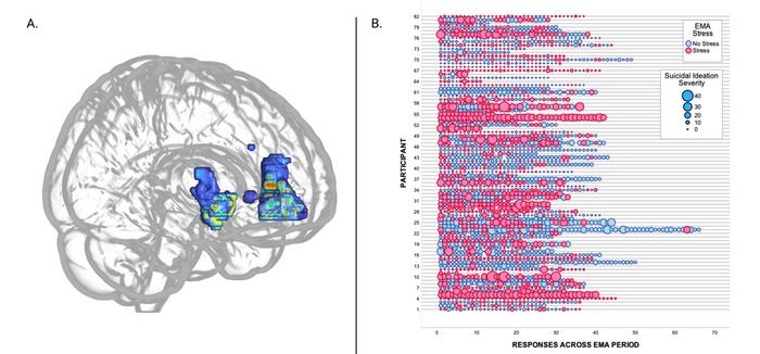 A: The neural decoder for cognitive reappraisal reflects the degree to which each participant engaged this emotion regulation strategy while exposed to cues of their negative memories. The image above depicts the “mask,” or cluster of voxels, that the decoder was comprised of. B: The graph depicts each participant's fluctuating suicidal thoughts epoch-by-epoch across the ecological momentary assessment (EMA) time period. The size of the data point reflects the severity of participants' suicidal thoughts, while the color indicates whether a stressor occurred (pink) or no stressors occurred (blue) during that epoch.