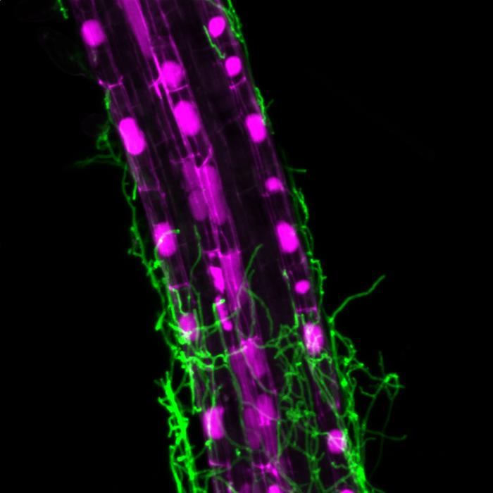 Purple: plant cell nuclei; green: hyphae of the root fungus Serendipita indica