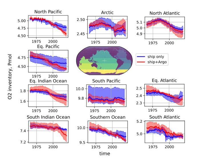 Basin-scale oxygen inventory trend with global ocean divided to 10 basins. Blue lines and shading show ensemble mean and ensemble range for ship-only reconstructions, and red lines and shading are for ship and Argo float reconstructions. The research team divided up the task by working on different basins. (Credit: Georgia Institute of Technology)