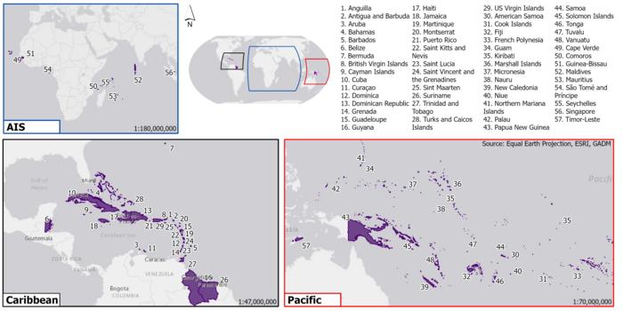 Image identifies where all 57 SIDS are located globally, including in the more concentrated regions of the Pacific (in red) and Caribbean (in black). Most SIDS are very small, meaning they have previously been missed out in global flood risk studies.