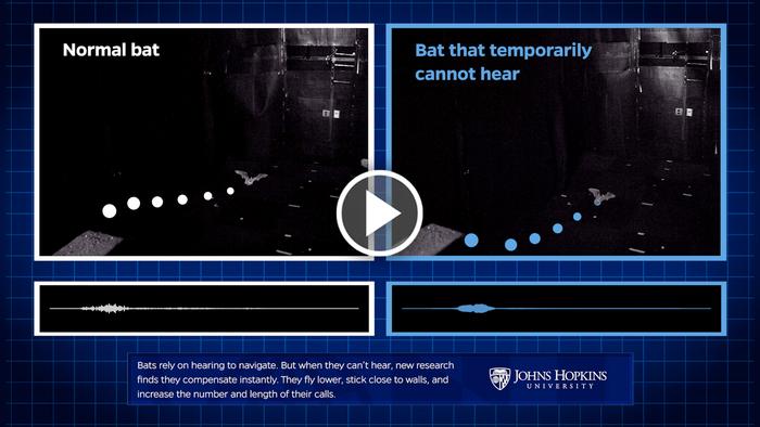 When bats can’t hear, new research finds that these hearing-dependent animals employ a remarkable compensation strategy. Compare how a bat with normal hearing and a bat that temporarily cannot hear fly from a platform, down a corridor and through a window to claim a treat.