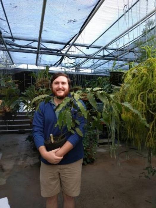 Alex Harkess holds the Amborella plant sequenced in this study in 2013, during his training in Leebens-Mack’s lab at UGA.