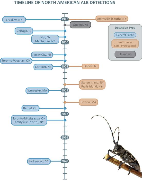 First detections of many significant invasive insects have been made by members of the public. In the case of the first-ever observation of Asian longhorned beetle (Anoplophora glabripennis) in the United States, a resident of Brooklyn, New York, noticed unusual damage on maple trees in his neighborhood in 1996. He then caught an adult beetle, which he reported and provided to the New York City Department of Parks and Recreation. Since then, 12 additional infestations of the invasive forest pest have been found in North America, and a member of the public was the first detector in two-thirds of those cases. Public observations have also initiated discoveries in recent years of the elm zigzag sawfly, spotted lanternfly, boxtree moth, northern giant hornet, yellow-legged hornet, emerald ash borer, and Jorō spider.