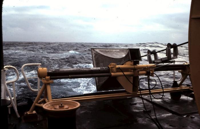 Looking from the stern of the ship as it tows the long horizontal array of hydrophones. The tow cable can be seen going through the metal horn at the stern. The hydrophone array is several hundred meters behind the ship and about 200 meters deep.
