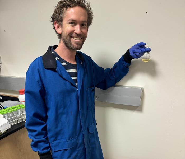 Kevin Lofgren in the lab holding a flask containing the pure biodiesel product made with the process described in the journal Energy & Fuels.