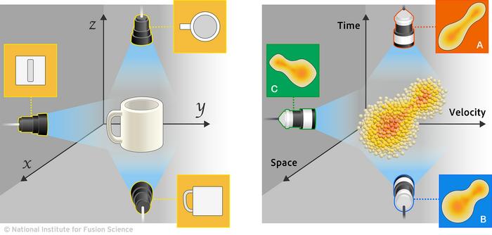 3D spatial tomography estimates the 3D structure of a subject from images taken from multiple directions. On the other hand, newly developed phase-space tomography estimates the plasma phase-space distribution by combining data obtained from highly resolved measurements in (A) velocity versus space, (B) velocity versus time, and (C) time versus space, respectively.