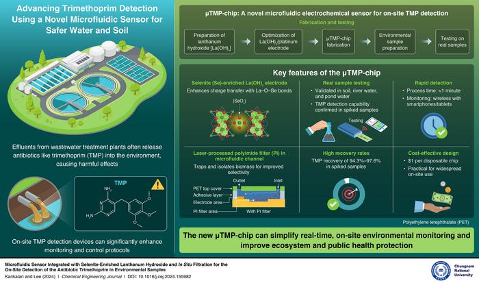 Professor Tae Yoon Lee and Dr. Natarajan Karikalan of Chungnam National University, Korea, have made a pioneering advancement in EC detection methods, that shows promise to revolutionize on-site testing for TMP in contaminated wastewater. They developed a disposable microfluidic lab-on-a-chip (LOC) EC sensor, μTMP-chip, designed for real-time TMP detection. “Efficient TMP monitoring in effluents is critical for effective control protocols. Hence, we aimed to enable in situ testing of water samples,” explains Prof. Lee. Their paper was made available online on September 21, 2024 and was published in Volume 499 of Chemical Engineering Journal on November 1, 2024.
