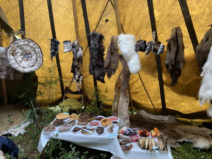 A variety of local traditional foods displayed during a Bakaldyn (celebration) in Kharyalakh, an Evenk settlement of the Arctic region. (Photo: Varvara Parilova)