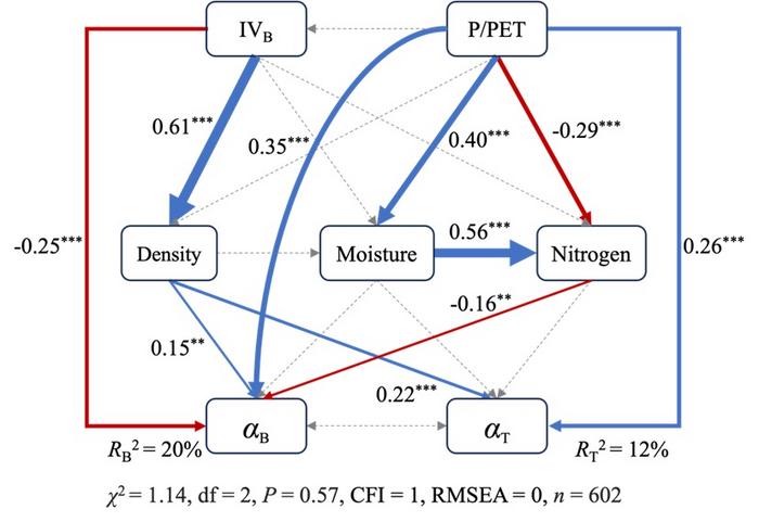 The SEM shows the combined effects of bamboo invasion, climate, and soil on the scaling exponents of the DBH–height allometries for bamboo and tree.