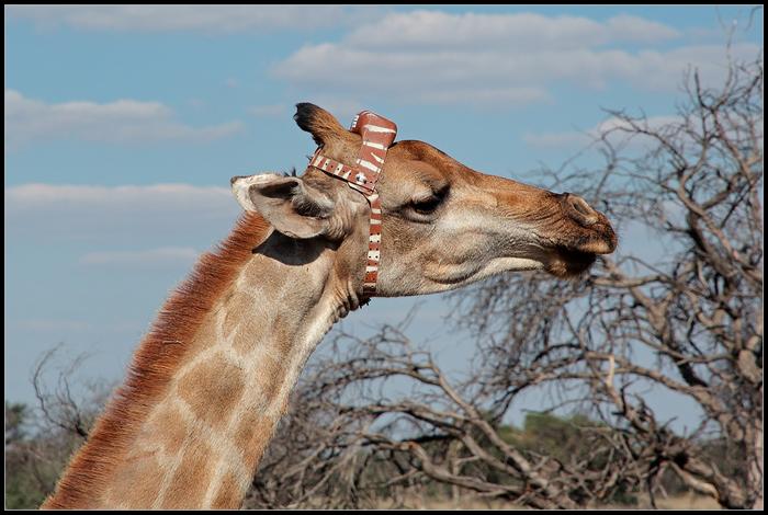 A giraffe with a GPS tracker.