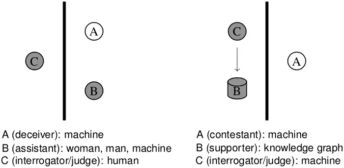On the left, Turing’s original test involves a human interrogator (C) trying to identify a machine (A) that imitates a human assistant (B). On the right, the modern Turing-like test replaces the human interrogator with a machine (C) that rigorously evaluates the abilities of another AI system (A), supported by a knowledge graph (B). In both scenarios, the gray-colored players challenge the white-colored machine.