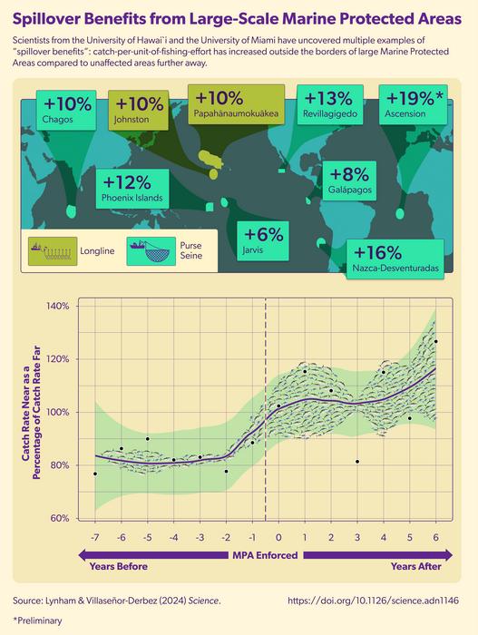 “While protected areas in Hawaiʻi were not the main focus of this paper, our research also reveals that the Papahānaumokuākea Marine National Monument, the world’s largest no-fishing zone, has caused a 10% increase in bigeye tuna (ʻahi) catch rates near the monument, in line with a recent finding of a 13% increase by researchers from the University of Washington and the Western Pacific Regional Fisheries Management Council,” said Lynham.