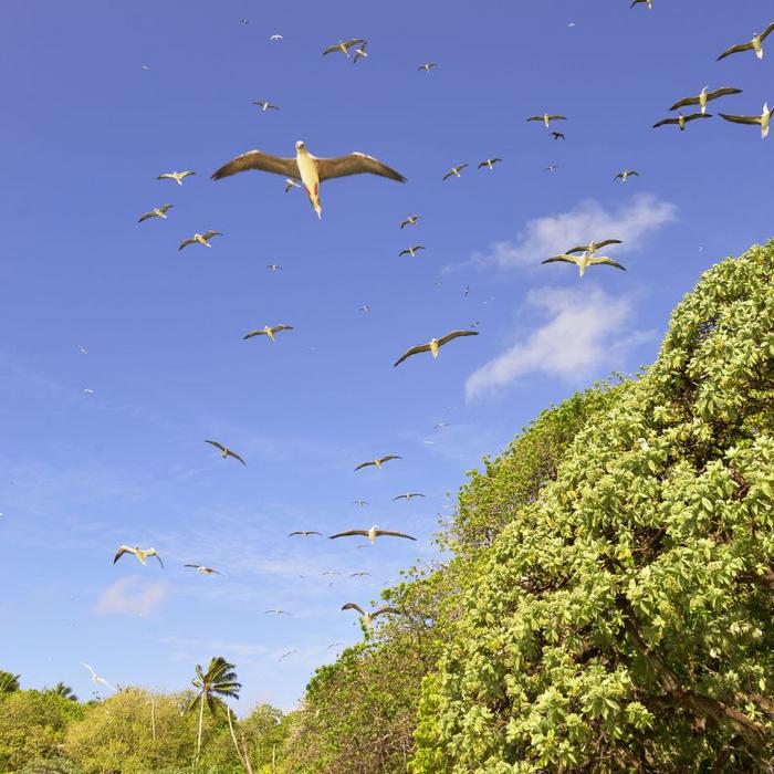 Seabirds like these red-footed boobies do not nest in coconut palms, so the reduction of broadleaf forests would deprive the atoll of the nutrients from their droppings.