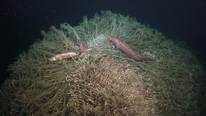 Congrio colorado (Genypterus chilensus) cusk-eels swim around a tubeworm mound near a methane seep. These fish — a commercially important fish highly valued in Chile — have been observed around reefs and soft-bottom mangrove ecosystems, but the importance of chemosynthetic ecosystems in sustaining their populations has not been previously observed. Credit: ROV SuBastian / Schmidt Ocean Institute