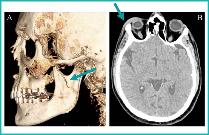 35-year-old transgender woman presents with (A) a 3D CT reformation of the face in the sagittal plane showing a left mandibular fracture (arrow). (B) An axial head CT image from one of three head CT studies over the last two years revealing right periorbital soft tissue swelling (arrow). The radiologist reader suspected intimate partner violence based on radiology reports, which was subsequently confirmed through clinical note examination.