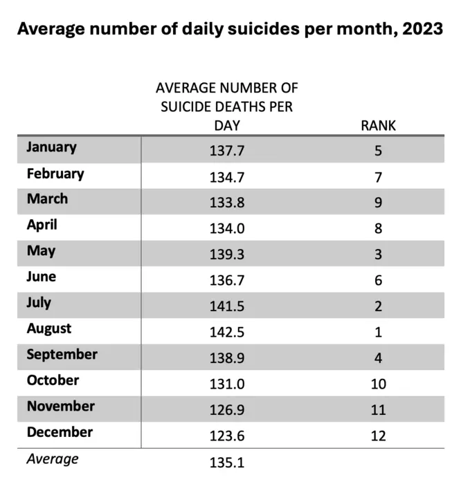 In 2023, the last full year for which CDC data are available, December had the lowest average daily suicide rate – it was 12th among the months, and November was 11th. January came in 5th. The months with the highest rates were August (1st) and July (2nd).