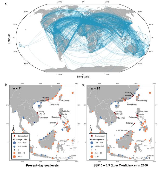 The study found that a Manila Trench tsunami could damage up to 11 international seaports under present-day sea-level conditions and up to 15 ports by 2100. In the most severely damaged locations, port closures could last over 200 days.