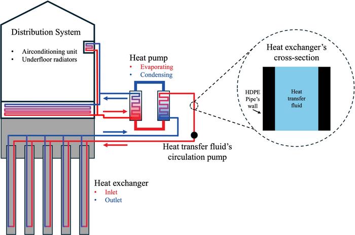The energy pile system consists of four main elements: the geostructure, the embedded heat exchanger, the heat pump unit, and the distribution system.
