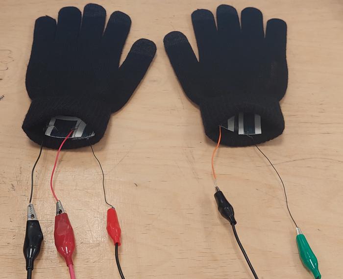 Gloves with swatches of e-textile attached inside and wired for sensing testing.