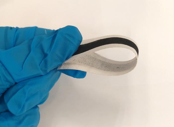 Strip of e-textile demonstrating the flexible qualities of ink-jet printed graphene.