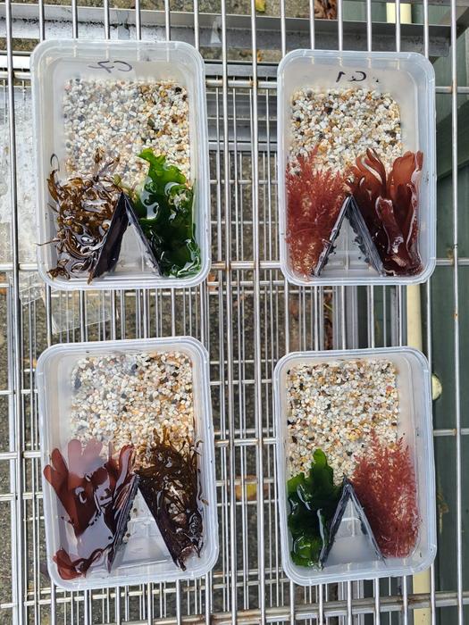 In the laboratory, the animals were placed in a box with two algae to hide in, one native and one exotic. Combinations of two of the four species studied were tested, always one native (green or red) and one exotic (brown or pink).