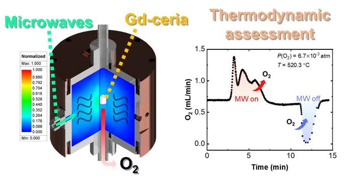 To address these challenges, the POSTECH team turned to a familiar yet underutilized energy source: “microwaves”1 energy, the same source used in household microwave ovens. While microwaves are commonly associated with heating food, they can also drive chemical reactions efficiently. The researchers demonstrated that microwave energy could lower the reduction temperature of Gd-doped ceria (CeO2)—a benchmark material for hydrogen production—to below 600℃, cutting the temperature requirement by over 60 percent. Remarkably, microwave energy was found to replace 75 percent of the thermal energy needed for the reaction, a breakthrough for sustainable hydrogen production.