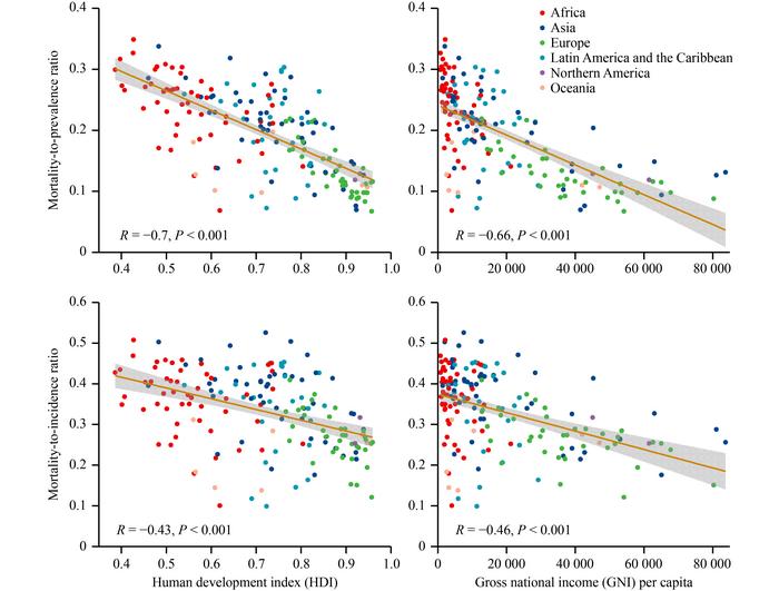 The analysis revealed that breast cancer was the most commonly diagnosed cancer worldwide, with lung cancer being the leading cause of cancer deaths. While high HDI regions reported the highest number of new cancer cases, the lowest mortality-to-prevalence (MPR) and mortality-to-incidence (MIR) ratios were observed in high-income countries in Northern America and Oceania. Conversely, the highest ratios were found in low HDI countries in Africa. The MPR and MIR, which reflect disease severity and healthcare quality, were high in males and older populations, indicating poorer prognosis in these demographics. High HDI and GNI were positively correlated with cancer incidence and mortality but negatively correlated with MPRs and MIRs, suggesting that socioeconomic development plays a crucial role in cancer outcomes.