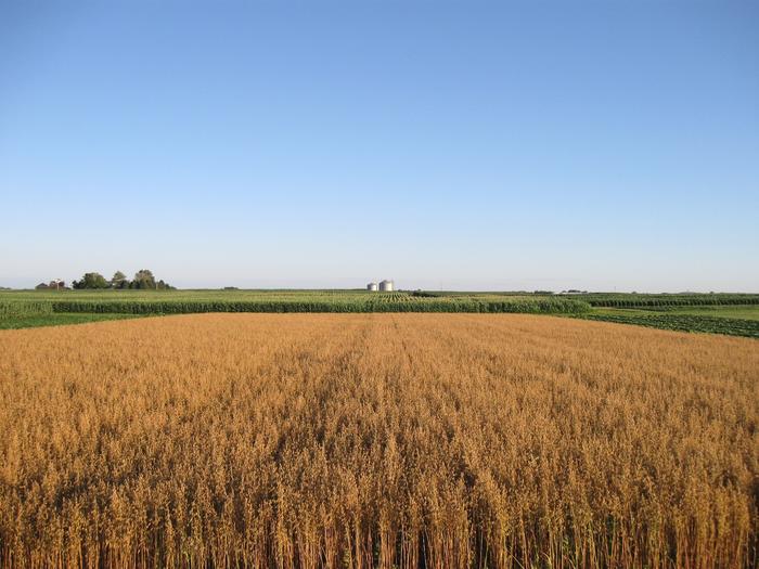 Oats growing near plots of corn at Iowa State University's Marsden Farm, where researchers have studied long-term rotations of crops since 2001.